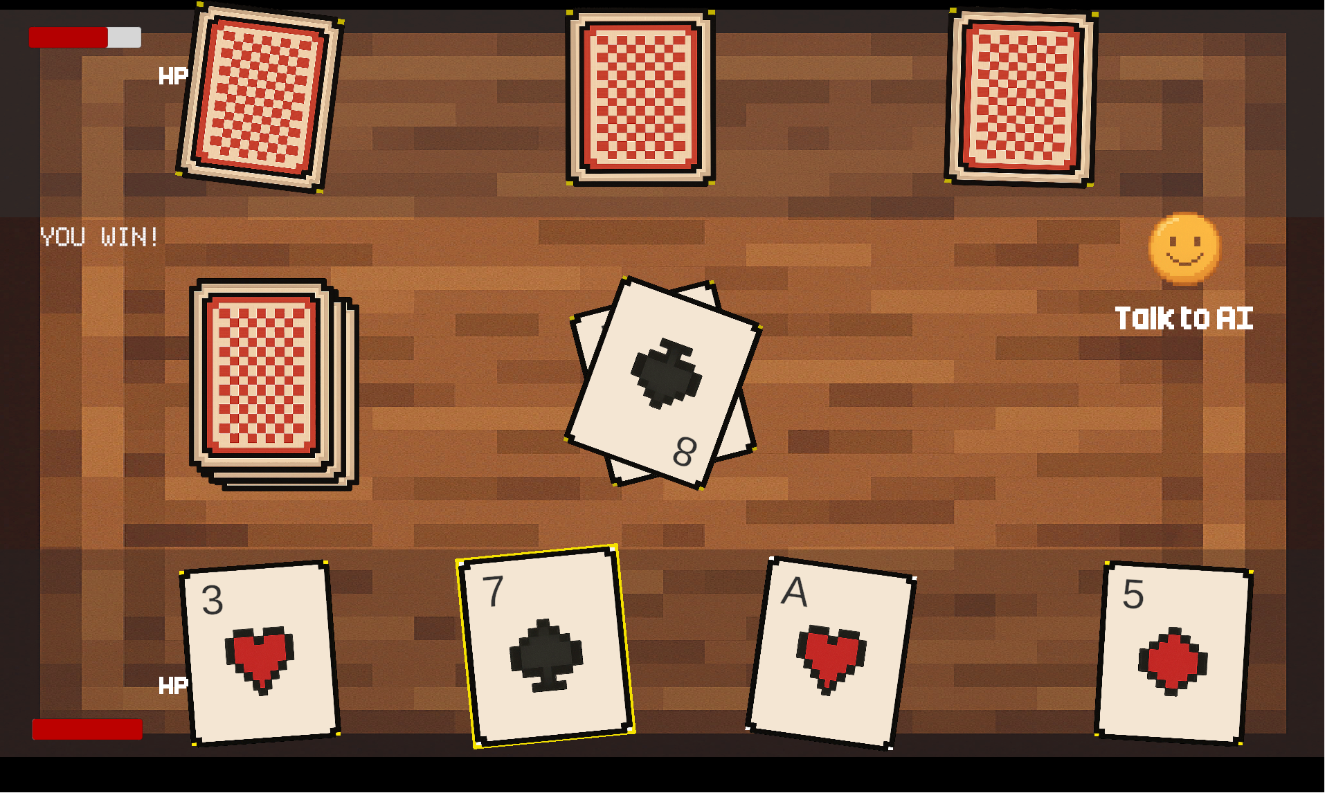 There are 3 levels in total. In each round, both the player and the AI start with 3 HP and 5 cards. Each turn, both sides play one card. The higher number wins. If the numbers are the same, suits are compared. The loser loses 1 HP. Reduce your opponent’s HP to 0 to win the round.