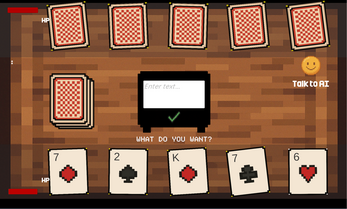 This is a card game where you battle against an AI opponent. The most powerful move isn’t simply playing the highest card (“K”), but persuading the AI to change the rules.